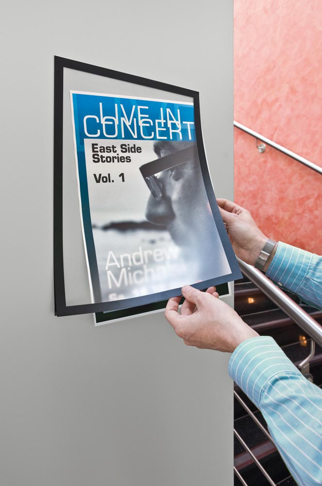 · Auf Glasflächen beidseitig lesbar · Beidseitig eingefärbter Rahmen · Vollflächige Selbstklebefolie auf der Rückseite · Einfaches Anbringen auf glatten, tragfähigen Oberflächen ohne Hilfsmittel; kann z. B. von Glas wieder entfernt werden · Aufklappbare, magnetische Vorderseite