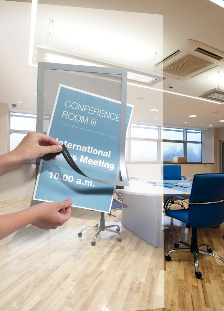 · Auf Glasflächen beidseitig lesbar · Beidseitig eingefärbter Rahmen · Vollflächige Selbstklebefolie auf der Rückseite · Einfaches Anbringen auf glatten, tragfähigen Oberflächen ohne Hilfsmittel; kann z. B. von Glas wieder entfernt werden · Aufklappbare, magnetische Vorderseite
